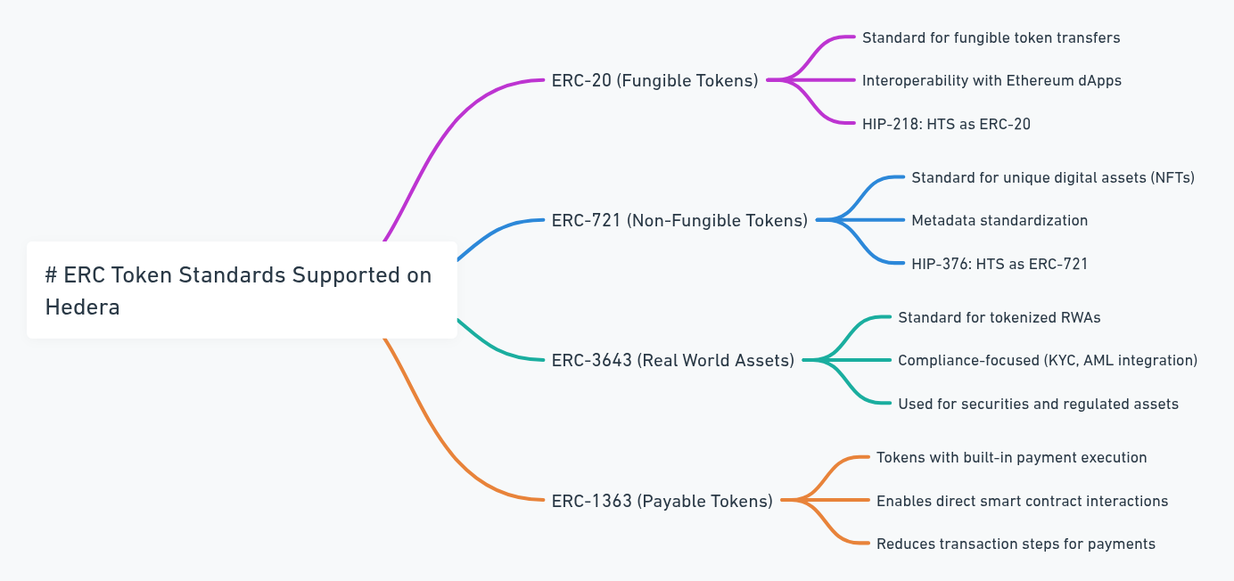 These standards enable the deployment of any smart contract, including DeFi applications and tokenization contracts like ERC-20 and ERC-721 tokens. This compatibility alows EVM developers to leverage familiar workflows, tools and, frameworks on Hedera.