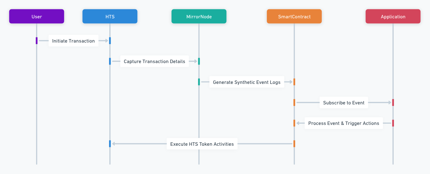 Smart contract tokens like ERC-20 and ERC-721 emit events, creating contract logs that developers can query or subscribe to. Hedera Token Service (HTS) tokens do not natively generate such event logs. As a solution to this limitation, Hedera Mirror Nodes generate synthetic event logs, enabling event-driven workflows to mimic the behavior of smart contract tokens for HTS transactions. Synthetic events are generated for transactions such as: