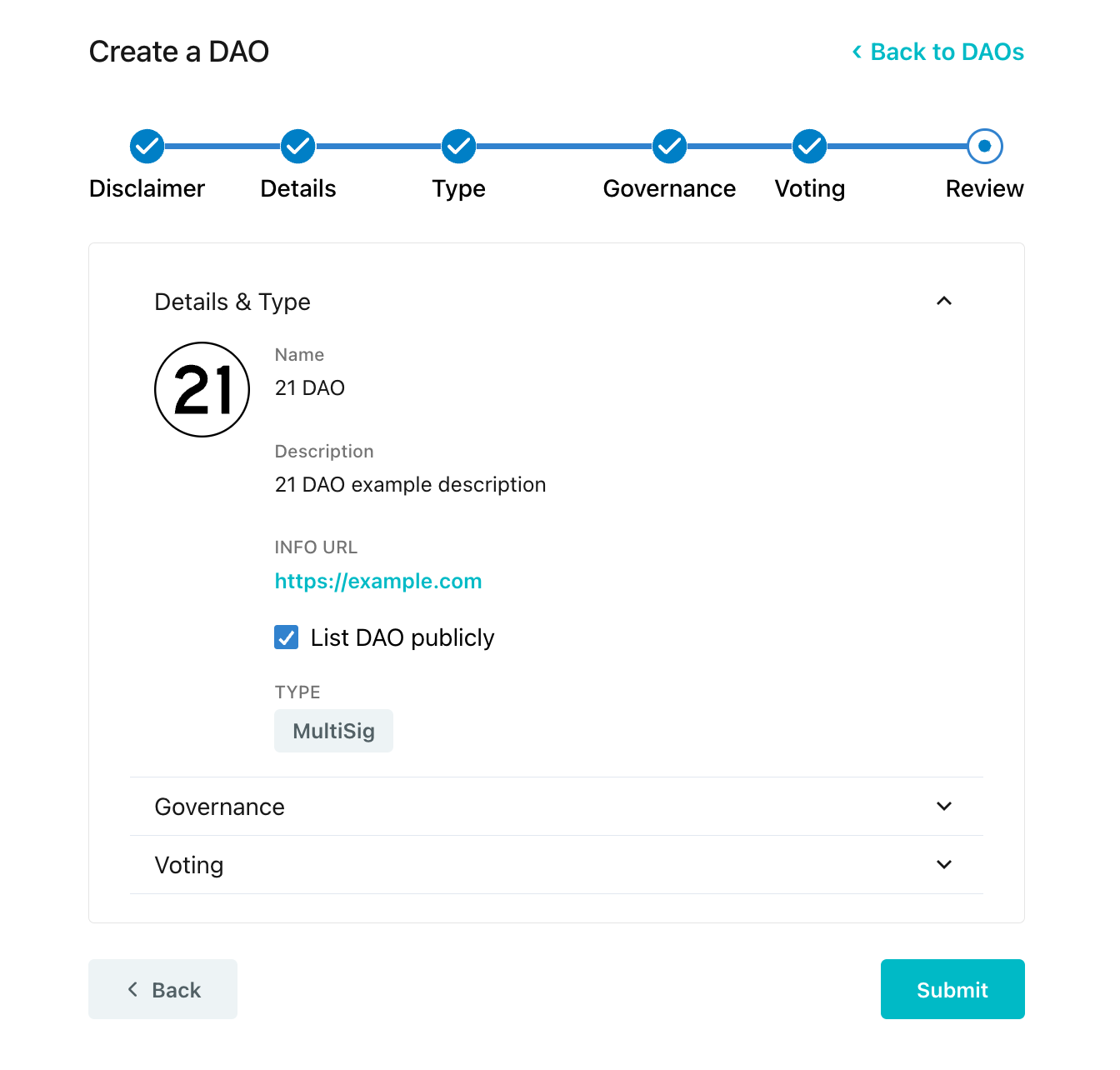 Review and Submit to Create DAO